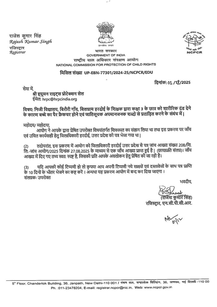 HRPC ने स्पष्ट कहा है कि बच्चों के साथ किसी भी प्रकार की हिंसा, भेदभाव या अमानवीय व्यवहार को बर्दाश्त नहीं किया जाएगा। HRPC ने NCPCR से ऐसी घटनाओं पर त्वरित कार्रवाई और स्कूलों में जवाबदेही सुनिश्चित करने की अपेक्षा की है।