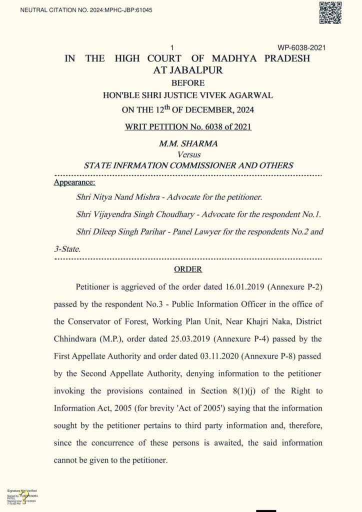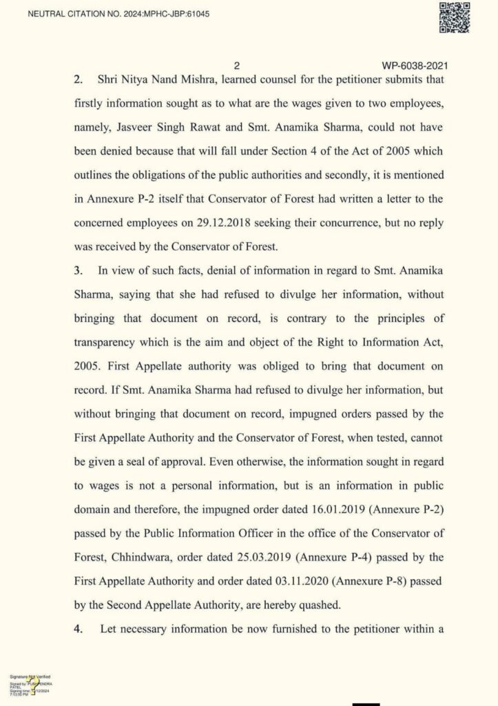 जिन्होंने बताया कि लोक सेवकों के वेतन की जानकारी को सार्वजनिक करना सूचना का अधिकार अधिनियम 2005 की धारा-4 के तहत अनिवार्य है। लोक सेवकों के वेतन की जानकारी को धारा 8 (1) (जे) का हवाला देकर व्यक्तिगत या तृतीय पक्ष की सूचना बताकर छिपाना अधिनियम के उद्देश्यों और पारदर्शिता के सिद्धांतों के विपरीत है। याचिकाकर्ता ने वन परिक्षेत्र छिंदवाड़ा में कार्यरत दो कर्मचारियों को हुए वेतन भुगतान के संबंध में जानकारी मांगी थी।